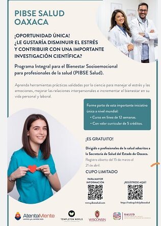 Oaxaca, Oaxaca, Sábado 18 de Marzo, 2023 (Fuente: Comunicado).- Los Servicios de Salud de Oaxaca (SSO), a través de la Asociación Civil “AtentaMente”, lanzaron la convocatoria para participar en el Programa Integral para el Bienestar Socioemocional dirigido a profesionales de la salud (PIBSE Salud) de la Jurisdicción Sanitaria Uno “Valles Centrales” que estén en contacto con pacientes.