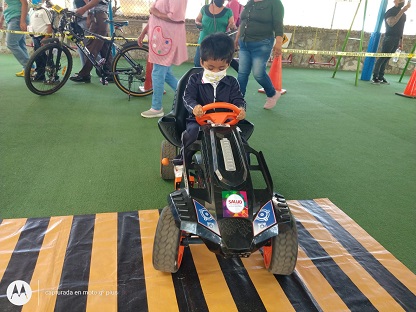 Como parte de la actividad, se realizó una demostración de cómo conducir un vehículo de motor para sensibilizar a grupos vulnerables sobre los factores de riesgo y evitar comportamientos riesgosos que desencadenen en lesiones, discapacidades y defunciones.