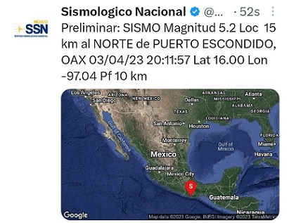 Oaxaca, Oaxaca, Martes 04 de Abril, 2023 (Fuente: Comunicado).- El gobierno del estado de Oaxaca informa que no se reportan daños, derivado del sismo de magnitud 5.5, con epicentro a 17 kilómetros al norte de Puerto Escondido, del distrito de Juquila, región Costa de Oaxaca, ocurrido la noche de este lunes.