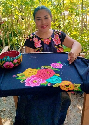 A su vez, Diana Laura Ramírez Toledo del municipio de la Heroica Ciudad de Juchitán de Zaragoza, en la región del Istmo de Tehuantepec, presentó sus textiles bordados tradicionales sobre terciopelo con aguja de gancho, en el que bordan las flores tradicionales de la región e incursionan en nuevos diseños, además de comercializar piezas de la joyería tradicional utilizada en las festividades de las velas istmeñas.