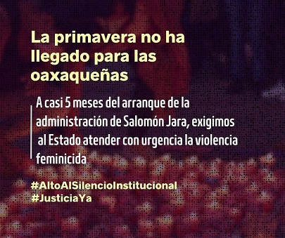 A casi 5 meses del arranque de la #PrimaveraOaxaqueña urgimos al Estado a atender de manera inmediata la violencia feminicida ¡Alto al silencio institucional!