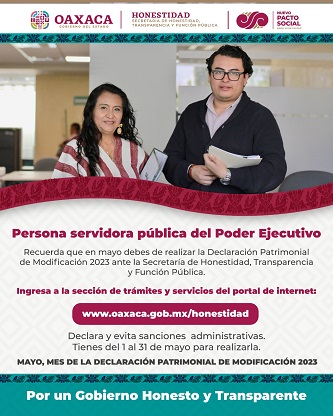 Oaxaca, Oaxaca, Sábado 06 de Mayo, 2023 (Fuente: Comunicado).- La Secretaría de Honestidad, Transparencia y Función Pública informó que durante el mes de mayo las personas servidoras públicas del Poder Ejecutivo estatal deben presentar su Declaración Patrimonial de Modificación 2023 e informar si hubo o no cambios a su patrimonio y en su caso, indicar la fecha, valor y medios de adquisición.