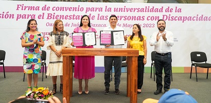 Para ello se firmó el Convenio para la incorporación a la Universalidad de la Pensión para el Bienestar de las Personas con Discapacidad del Estado de Oaxaca, entre el Gobernador del Estado Salomón Jara Cruz y la secretaria de Bienestar del Gobierno Federal Ariadna Montiel Reyes.