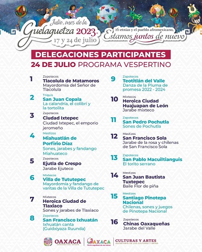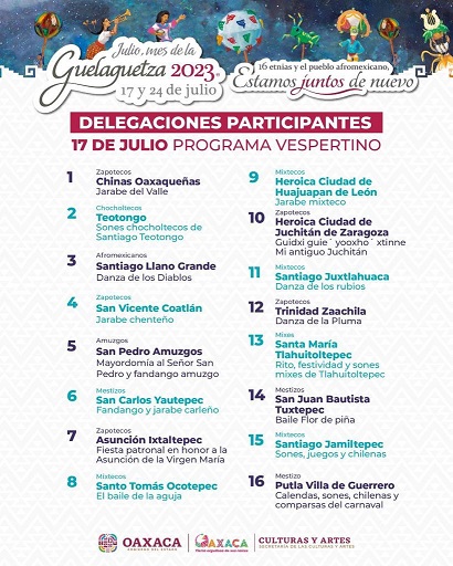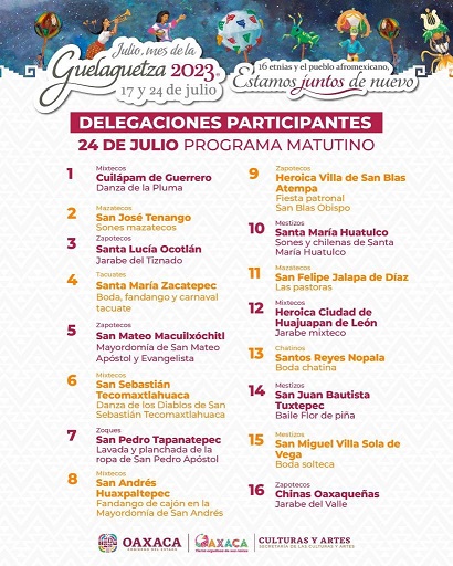Dijo que el programa Expresiones Artísticas y Culturales de la Guelaguetza 2023 abre espacios para las manifestaciones de los pueblos indígenas, mestizos y afromexicano. Se recalcó que todas las delegaciones que desfilarán tendrán un trato digno, sin distinciones.