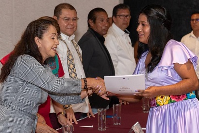 Las y los 32 escolares provenientes de las diferentes regiones del estado recibieron su constancia de estudios por parte de la secretaria de Educación Pública en Oaxaca Delfina Guzmán Díaz y de la directora general del CECyTEO Blanca Martínez.