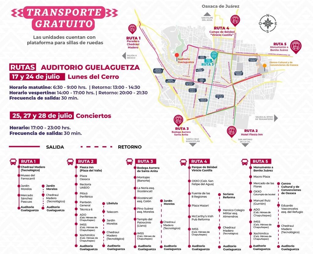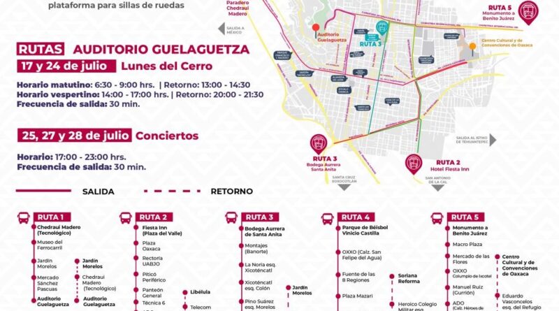 Oaxaca, Oaxaca, Lunes 17 de Julio, 2023 (Fuente: Comunicado).- El gobierno del estado, a través de la Secretaría de Movilidad en coordinación con el Sistema de Transporte Colectivo Metropolitano Citybus, recuerda a oaxaqueñas, oaxaqueños y visitantes en general las cinco Rutas Guelaguetza que ofrecerán el servicio de traslado gratuito al Auditorio Guelaguetza para las presentaciones matutina y vespertina del primer Lunes del Cerro.