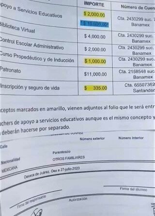 Mientras tanto, continúa circulando la hoja con los diferentes conceptos y los números de cuenta donde se pagan dichos «impuestos» para estudiar en la Facultad de Medicina y Cirugía de la UABJO.