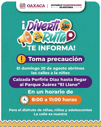 Oaxaca, Oaxaca, Sábado 19 de Agosto, 2023 (Fuente: Comunicado).- Como parte de las actividades del festival VeraNiñez, se llevó a cabo la presentación de la DivertiRuta, actividad que se realizará este domingo 20 de agosto en donde niñas, niños, adolescentes y público en general podrán disfrutar de más de 40 actividades lúdicas, recreativas y deportivas que forman parte de este programa.