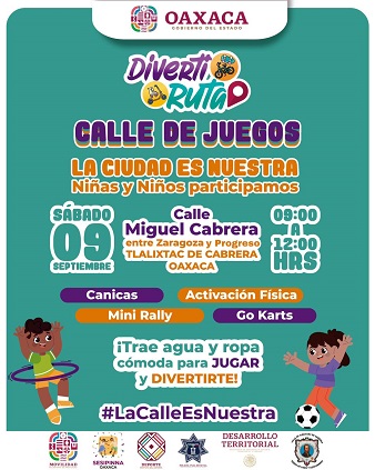 Oaxaca, Oaxaca, Sábado 09 de Septiembre, 2023 (Fuente: Comunicado).- El programa DivertiRuta que impulsa el Gobierno del Estado para fomentar la convivencia pacífica entre la sociedad, llegará este sábado 9 de septiembre al municipio de Tlalixtac de Cabrera, cercano a la capital de Oaxaca.