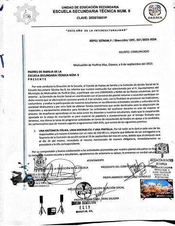“Hacemos un llamado al comité de padres de familia para que convoque a una reunión urgente e informen si la escuela es un espacio educativo o una empresa que les genera plusvalía. A los padres o tutores los invitamos a no permitir actos de corrupción: el nuevo fraude a los tutores sería mayor a 500 mil pesos, de manera obligatoria entregan a las alumnas 6 boletos que se tendrán que pagar, porque en el oficio turnado se especifica el término obligatorio; si sumamos todos los rubros como cuota de inscripción y otros, la Escuela Secundaria Técnica número 9 de Miahuatlán, Oaxaca, se convirtió en una empresa y dejó de ser una institución educativa pública, como lo especifica el artículo 3º Constitucional.
