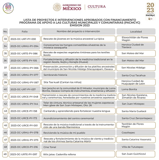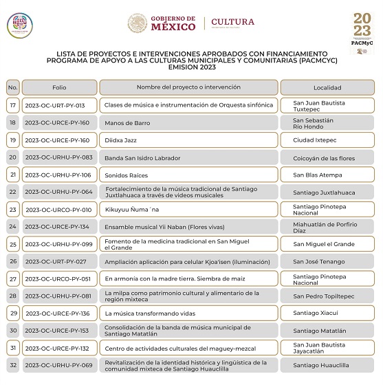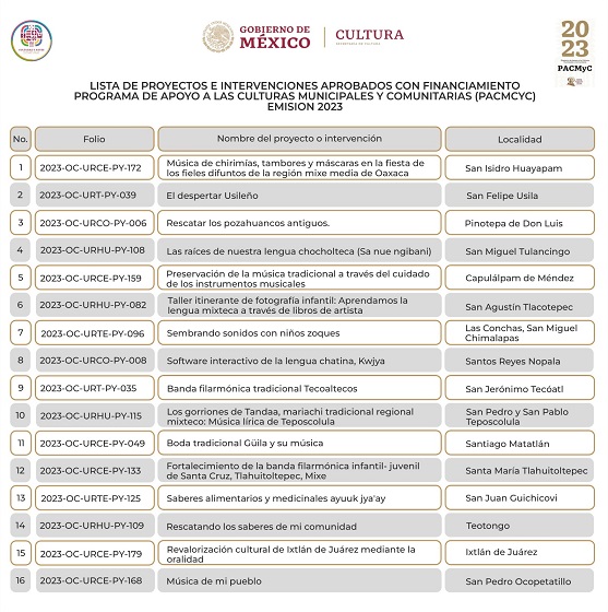 Oaxaca, Oaxaca, Viernes 29 de Septiembre, 2023 (Fuente: Comunicado).- La Secretaría de las Culturas y Artes (SECULTA) de Oaxaca, a través de la Dirección de Conservación y Divulgación Cultural dio a conocer la lista de proyectos aprobados con financiamiento del Programa de Apoyo a las Culturas Municipales y Comunitarias (PACMyC), en su emisión 2023.
