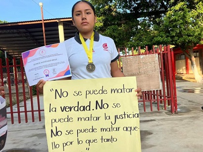 Durante la mañana de hoy con pancarta en mano, la madre de Eunice exige junto a su hija: una disculpa pública y la destitución de la Dra. Verónica Hernández González. La joven zapoteca fue excluida del concurso nacional sin una explicación clara, y esto deja una mancha en la integridad del proceso de selección, señala la señora María del Socorro.