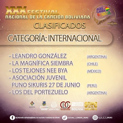 Cabe precisar que el XXX Festival Nacional de la Canción Boliviana Aquí… Canta Bolivia se desarrollará los días 30 de noviembre, 1 y 2 diciembre en la ciudad de Oruro, Bolivia.