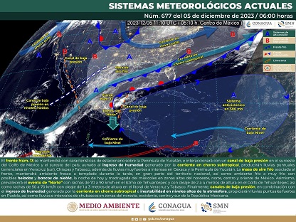 Oaxaca, Oaxaca, Martes 05 de Diciembre, 2023 (Fuente: Comunicado).- La Coordinación Estatal de Protección Civil y Gestión de Riesgos (CEPCyGR) informa que el frente frío número 13 se extiende desde la porción sur de Veracruz, hasta el sur de la Florida, se espera que permanezca estacionario por lo menos este martes, ocasionando algunas lluvias y lloviznas intermitentes, sobre la Cuenca del Papaloapan, y algunas zonas de la Sierra de Juárez.