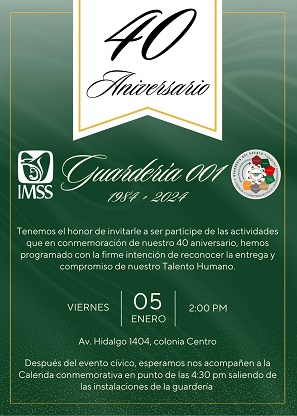 De acuerdo con la jefa del Departamento de Guarderías, María del Carmen Rebeca López Hernández, en el marco del 40 aniversario, por la mañana se ofrecerá un desayuno al personal de la estancia infantil y, a las 14 horas se realizará un acto cívico-cultural con la participación de exalumnos y la presencia de trabajadores jubilados, con el fin de reconocer la entrega y compromiso del talento humano.