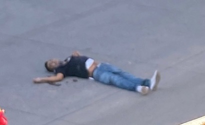 El hombre que vestía playera tipo polo en color azul marino, pantalón de mezclilla azul y tenis blancos, cayó desvanecido sobre el pavimento de la calle.