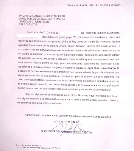 Oaxaca, Oaxaca, Sábado 13 de Enero, 2024 (Fuente: Agencias).- Una madre de familia denunció la omisión del director de la escuela primaria “Enrique C. Rébsamen”, Arcángel Quiroz Nicolás, quien no ha tomado acciones ante el bullying que sufre su hija en dicha institución.