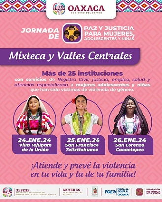 Oaxaca, Oaxaca, Martes 23 de Enero, 2024 (Fuente: Comunicado).- En seguimiento a las acciones interinstitucionales para erradicar la violencia de género en las ocho regiones de la entidad, el Secretariado Ejecutivo del Sistema Estatal de Seguridad Pública (SESESP) llevará la Jornada de Paz y Justicia para Mujeres, Adolescentes y Niñas a la Mixteca y Valles Centrales.