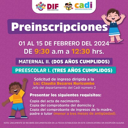 A través de la Dirección de Desarrollo Familiar y Social anuncia que del 1 al 15 de febrero es el periodo de preinscripciones para el Ciclo Escolar 2024-2025 en las áreas de Maternal ll correspondiente a los dos años cumplidos y Preescolar 1 correspondiente a los tres años cumplidos.