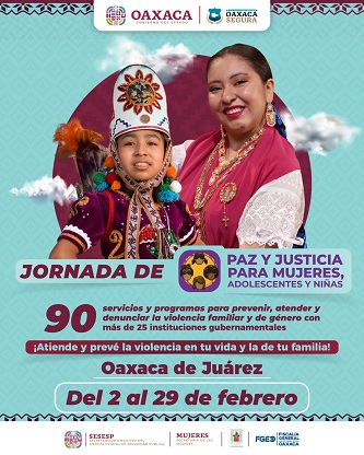 Oaxaca, Oaxaca, Viernes 02 de Febrero, 2024 (Fuente: Comunicado).- En el marco del Programa Oaxaca Segura, del 2 al 29 de febrero, la Jornada de Paz y Justicia para Mujeres, Adolescentes y Niñas recorrerá la capital del estado con más de 25 instituciones que brindarán 90 servicios de forma gratuita; en atención a las acciones encaminadas a prevenir y erradicar la violencia de género en los municipios de mayor incidencia de casos.