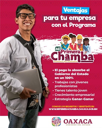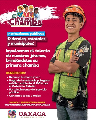 Oaxaca, Oaxaca, Miércoles 14 de Febrero, 2024 (Fuente: Comunicado).- El gobierno del estado de Oaxaca convoca a empresas e instituciones públicas a participar en el programa Mi Primera Chamba y otorgar espacios laborales para el desarrollo de la juventud profesionista de la entidad.