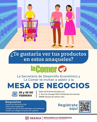 Oaxaca, Oaxaca, Jueves 22 de Febrero, 2024 (Fuente: Comunicado).- Para fortalecer la presencia de productos oaxaqueños en el mercado nacional, la Secretaría de Desarrollo Económico (SEDECO) realizará mesas de negocios los días 28 y 29 de febrero, entre personas productoras locales y representantes de la cadena de tiendas de autoservicio La Comer.