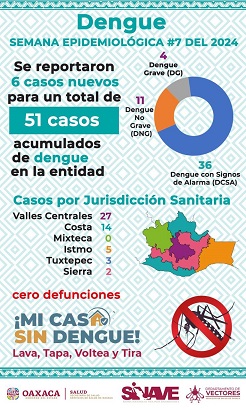 Asimismo, hizo un llamado a la población y a las autoridades municipales, principalmente de los municipios que presentan mayor número de casos, como Oaxaca de Juárez, Santa María Huatulco, Santa María Atzompa, San Agustín de las Juntas y Mártires de Tacubaya, para que se sumen a las actividades de patio y vivienda limpia, para eliminar los criaderos como latas, botellas y objetos en desuso, ya que la estrategia es fundamental para disminuir los contagios del padecimiento.
