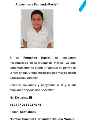 Por eso, actualmente están pidiendo apoyo para niño que fue atacado por 3 perros de la raza pitbull en Pochutla.