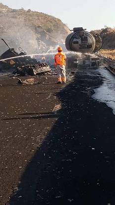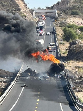 El incidente involucró una pipa de doble remolque que se desplazaba en dirección Tehuacán-Oaxaca, cargada con combustible, presuntamente diésel, y un camión tipo Torton que viajaba en la dirección opuesta.