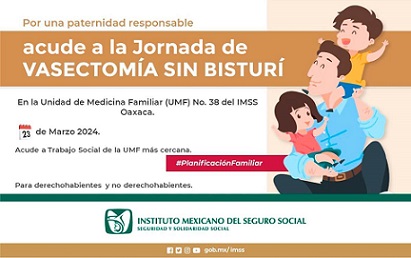Oaxaca, Oaxaca, Miércoles 20 de Marzo, 2024 (Fuente: Comunicado).- El Instituto Mexicano del Seguro Social (IMSS) en Oaxaca, a través de su Jefatura de Servicios de Prestaciones Médicas, invita a la población masculina derechohabiente y no derechohabiente a inscribirse en los procedimientos de vasectomía sin bisturí que se estarán llevando a cabo en las Unidades de Medicina Familiar (UMF).