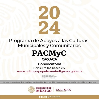 Oaxaca, Oaxaca, Viernes 22 de Marzo, 2024 (Fuente: Comunicado).- A fin de fortalecer el desarrollo de la cultura popular a través de proyectos que impulsen diversas iniciativas en la entidad, se presentó la convocatoria del Programa de Apoyo a las Culturas Municipales y Comunitarias (PACMYC) 2024.