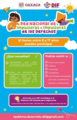 Oaxaca, Oaxaca, Miércoles 03 de Abril, 2024 (Fuente: Comunicado).- El Sistema para el Desarrollo Integral de la Familia (DIF) Oaxaca invita a las Niñas, Niños y Adolescentes (NNA) de 8 a 17 años de las ocho regiones del estado a formar parte de la Red Nacional de Impulsoras e Impulsores de los Derechos 2024 que dirige el Sistema Nacional DIF, a fin de brindar a este sector de la población un espacio seguro en donde puedan aprender, difundir y aplicar sus derechos y obligaciones.