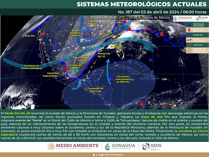 Lo anterior, de acuerdo con la Comisión Nacional del Agua (Conagua) que señala que tras el paso del frente frío número 43 por el sureste del país, se esperan intervalos de tolvaneras por la tarde y evento de Norte en el Istmo y Golfo de Tehuantepec, debido a la masa de aire frío que impulsa al sistema frontal.