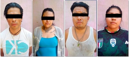 El despliegue policial encabezado por elementos de la Agencia Estatal de Investigaciones (AEI) se realizó en un domicilio ubicado en la colonia Volcanes en el municipio de Oaxaca de Juárez, donde se logró la detención de cuatro personas, dos hombres identificados como E.H.J. y L.B.F., así como dos mujeres con iniciales M.S.G.R. y D.M.V.R.