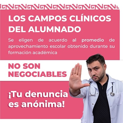 La institución señala que el proceso de asignación de campos clínicos para internado médico de pregrado y servicio social de las licenciaturas en medicina, enfermería, psicología, odontología y carreras afines, no son negociables.