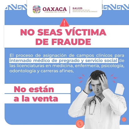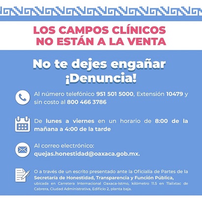 Oaxaca, Oaxaca, Jueves 02 de Mayo, 2024 (Fuente: Comunicado).- Los Servicios de Salud de Oaxaca (SSO) a través de la Dirección de Enseñanza y Calidad, exhortan a la población a denunciar la corrupción por asignación de un campo clínico con ingreso directo o un cambio de adscripción de una unidad médica a otra, a cambio de alguna remuneración económica o de cualquier otro beneficio.