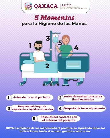En este sentido, la institución señala que existen cinco momentos para la higiene de las manos en el personal de salud, primero; antes de tocar al paciente, segundo; antes de realizar una tarea limpia/aséptica, tercero; después del riesgo de exposición a líquidos corporales, cuarto; después de tocar al paciente y quinto; después del contacto con el entorno del paciente.