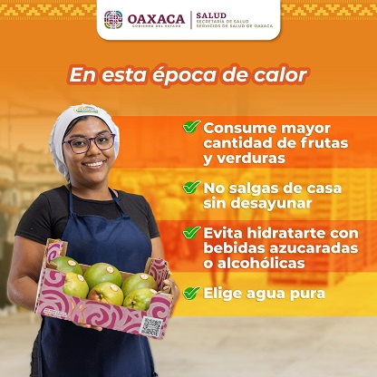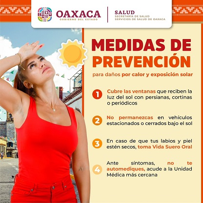 Oaxaca, Oaxaca, Martes 07 de Mayo, 2024 (Fuente: Comunicado).- Ante la segunda ola de calor que continúa en diversas regiones de la entidad, Servicios de Salud de Oaxaca (SSO) exhortan a la población a reforzar medidas para prevenir afectaciones a la salud relacionadas a este evento, así como a buscar atención médica oportuna.
