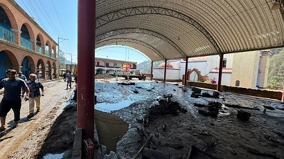 *La explanada de la agencia Asunción Mixtepec, con lodo, arbustos y ramas