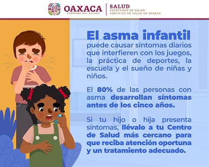 Oaxaca, Oaxaca, Miércoles 08 de Mayo, 2024 (Fuente: Comunicado).- El asma es una de las principales enfermedades no transmisibles más habituales en la población infantil, de ahí que Servicios de Salud de Oaxaca (SSO) recomienda a la población que ante síntomas como tos, sibilancias, dificultad para respirar y opresión torácica, acudan a sus servicios médicos para un diagnóstico oportuno.