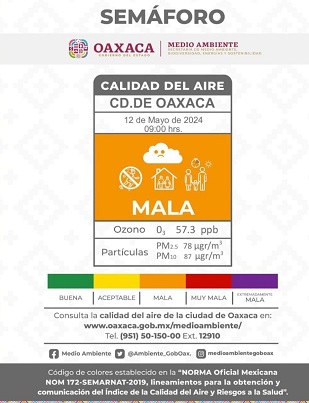 Oaxaca, Oaxaca, Lunes 13 de Mayo, 2024 (Fuente: Comunicado).- Servicios de Salud de Oaxaca (SSO) informa que debido a la mala calidad del aire que se reporta este 12 de mayo en la Zona Metropolitana de Oaxaca, de acuerdo al semáforo naranja de la Secretaría de Medio Ambiente, Biodiversidad, Energías y Sostenibilidad, se debe llevar a cabo las siguientes acciones protectoras establecidas en el Programa de Respuesta a Contingencias para evitar riesgos a la población.