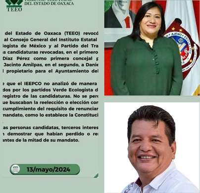 Oaxaca, Oaxaca, Martes 14 de Mayo, 2024 (Fuente: Hiram Moreno).- El Tribunal Estatal Electoral de Oaxaca (TEEO) tumbó las candidaturas de Daniel Méndez Sosa del Partido del Trabajo (PT) en Salina Cruz (región Istmo de Oaxaca), y de Gabriela Adriana Días Pérez del Partido Verde Ecologista de México (PVEM) en San Jacinto Amilpas, región Valles Centrales de Oaxaca.