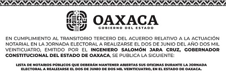 Tal como lo establece la Ley de Notariado para el Estado de Oaxaca y con base en el Artículo 302 de la Ley General de Instituciones y Procedimientos Electorales, el notariado estatal se notificó para que sus oficinas permanezcan abiertas en todas las regiones de la entidad, salvo excepciones que han solicitado licencia por participar como candidatas o candidatos en el proceso electoral.