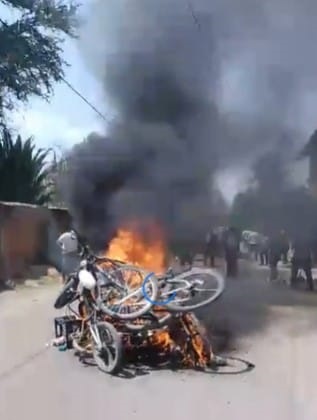 Sobre la carretera que conduce a la población, había una motocicleta que fue incendiada, junto con varias bicicletas, como barricadas para que ambos grupos se contuvieran de reiniciar otro enfrentamiento.