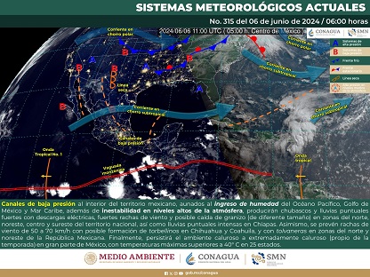 Lo anterior, de acuerdo con el pronóstico del tiempo emitido por la Comisión Nacional del Agua (Conagua) que señala que esto es derivado por un canal de baja presión sobre el sureste de México en combinación con la entrada de aire húmedo del pacífico y el tránsito de la onda tropical número dos.