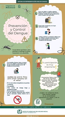 Oaxaca, Oaxaca, Viernes 07 de Junio, 2024 (Fuente: Comunicado).- Ante el incremento de la cadena de contagios de dengue en los últimos días en algunas comunidades de la entidad, el Instituto Mexicano del Seguro Social (IMSS) en Oaxaca, reitera nuevamente el llamado a toda la población en general para prevenir y controlar los casos de dengue.