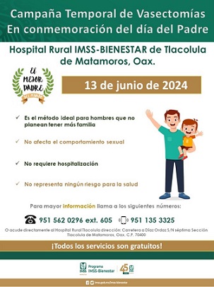 Oaxaca, Oaxaca, Martes 11 de Junio, 2024 (Fuente: Comunicado).- En el marco de la conmemoración del Día del Padre, este 16 de junio, el Instituto Mexicano del Seguro Social (IMSS) en Oaxaca realizará una campaña temporal de vasectomías programada para el 13 de junio, en el Hospital Rural Tlacolula de Matamoros de IMSS-Bienestar.