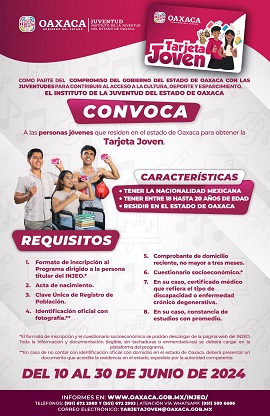 Del 10 al 30 de junio, las personas interesadas con nacionalidad mexicana podrán inscribirse en las páginas: www.tarjetajoven.oaxaca.gob.mx o https://www.oaxaca.gob.mx/injeo/.