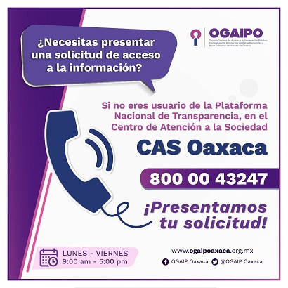 Oaxaca, Oaxaca, Viernes 21 de Junio, 2024 (Fuente: Comunicado).- El Órgano Garante de Acceso a la Información Pública, Transparencia, Protección de Datos Personales y Buen Gobierno del Estado de Oaxaca (OGAIPO) pone a disposición de la ciudadanía el Centro de Atención a la Sociedad CAS-OAXACA, con la finalidad de apoyar a aquellas ciudadanas y ciudadanos que no cuenten con un usuario en la Plataforma Nacional de Transparencia (PNT) a realizar una solicitud de acceso a la información pública, a través de una llamada telefónica.