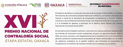 Oaxaca, Oaxaca, Lunes 01 de Julio, 2024 (Fuente: Comunicado).- La Comisión Permanente de Contralores Estados-Federación, a través de la Secretaría de Honestidad, Transparencia y Función Pública del Gobierno de Oaxaca, invita a los Comités de Contraloría Social, organizaciones de la sociedad civil y a la sociedad en general a participar en la XVI edición del Premio Nacional de Contraloría Social 2024, en su etapa estatal.